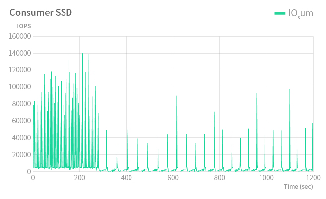 When you take a closer look at the detailed performance test, you may find that SSD performance changes over time. SSD vendors sugarcoat the performance figures by revealing only part of the whole picture.