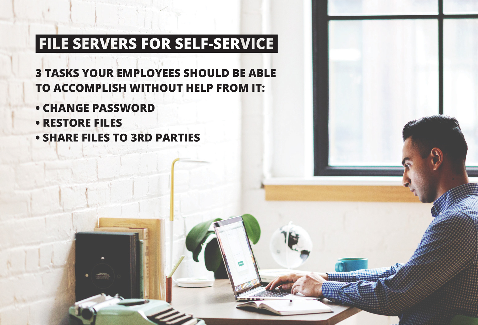 Save them the trouble with a business file server solution that allows employees to safely handle many storage issues themselves. Simple things like changing passwords and restoring files shouldn’t require someone to fill out a help ticket.