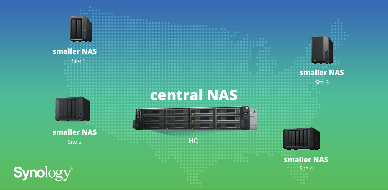 Traditionally, businesses have kept data stored in one server or cloud, meaning employees at remote offices would have to deal with slow transfer speeds. These days, multi-site businesses can set a new structure for data storage and management with a large network-attached storage (NAS) device deployed at company headquarters and a smaller NAS at each branch office. From there, you can easily sync files between NAS systems and across offices.