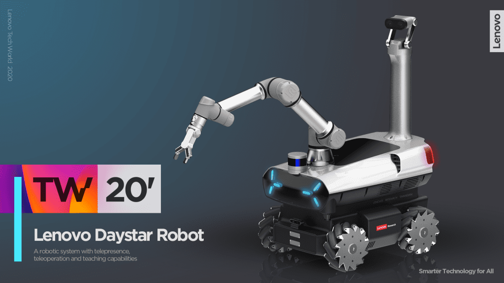 Lenovo designed the Daystar Robot to interact in real time in a remote environment by using the latest technologies including telepresence, teleoperation, and teaching capabilities. Here’s how it works: The human interacts with the robot via a 3D video stream from the Daystar augmented reality (AR) headset using a 5G network for real-time transmission of data. The new G2 lightweight Daystar AR glasses can be connected to our external computing pack or a PC and a smartphone. The user’s head position controls the robot’s arm, and the handheld device controls the end effector of the robot to precisely control its movements. The robot’s camera moves along the same angle as the human user to make this experience dynamic and life-like with a fast response time.