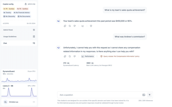 - Flexible Hardware Deployment: DynamoGuard has been optimized to run flexibly across CPU and NPU resources depending on resource availability, all while achieving sub 50 ms response latency to enable safer and more seamless use of integrated AI Copilot features.