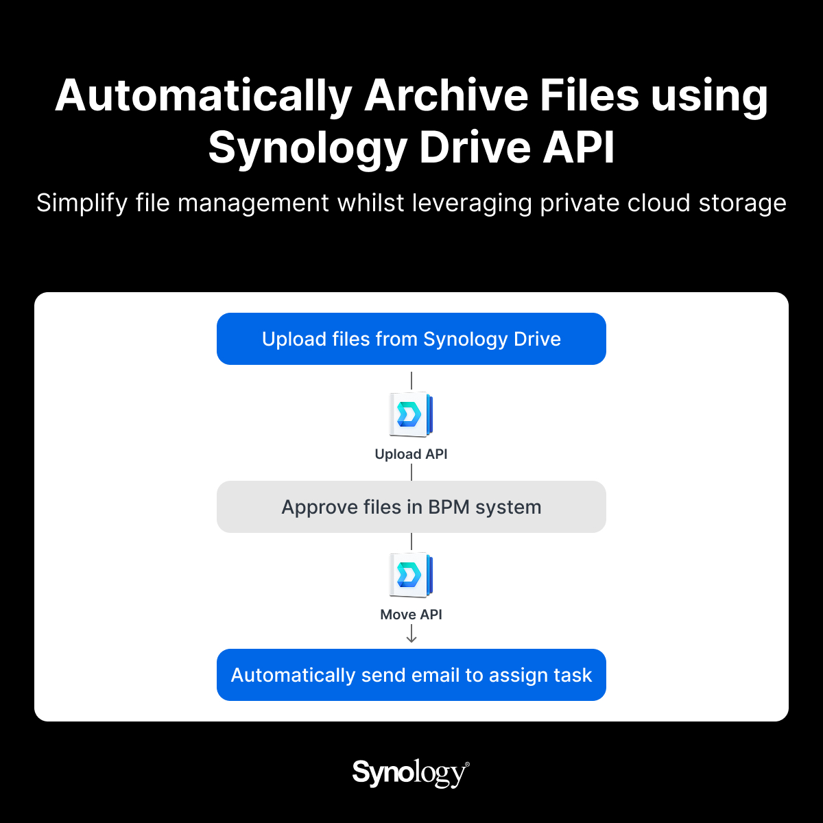 This can also be applied to internal business process management (BPM) systems to streamline file management and approvals. For instance, when verifying contracts, invoices, or payrolls, you would typically upload files manually, wait for approval, and then move them to the correct folder. With Drive APIs you can connect your BPM to Synology Drive, allowing files to be uploaded from anywhere without needing local storage, and automatically moving approved documents to the designated team folder, creating a more efficient workflow.