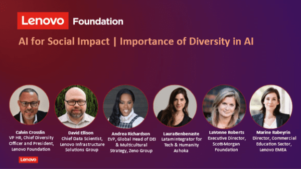 The second in a series of webinars, the Lenovo Foundation hosted the AI for Social Impact: Importance of Diversity in AI webinar on June 13, 2024, exploring how non-profit organizations can integrate diversity and inclusion into AI technologies and solutions. The session featured a keynote on diverse data in AI solutions by Dr. David Ellison, Chief Data Scientist of Lenovo, followed by a panel discussion with leading voices at the intersection of AI and diversity: Laura Benbenaste, LATAM Integrator for Tech & Humanity at Ashoka; LaVonne Roberts, Executive Director of Scott-Morgan Foundation; and Marine Rabeyrin, Director, Commercial Education Sector of Lenovo EMEA and Lenovo representative for Cercle InterL. Moderated by Andrea Richardson, EVP, Global Head of DEI & Multicultural Strategy at Zeno Group, the experts discussed their efforts to integrate diverse data sets into their AI solutions in various ways, ranging from education to disability to social and economic diversity.