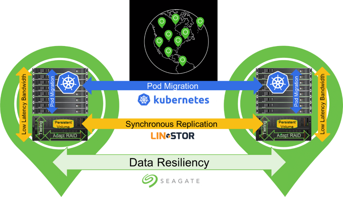 While Seagate Exos storage can, of course, be used to present block devices to any storage software stack, Seagate has developed an Exos back-end driver specifically for LINSTOR — enabling fine-grain volume control of the Seagate ADAPT hardware RAID engine. With this driver solution in place, hardware-based thin provisioning, SSD/HDD auto tiering and snapshots now are orchestrated by Kubernetes with geo-replication.