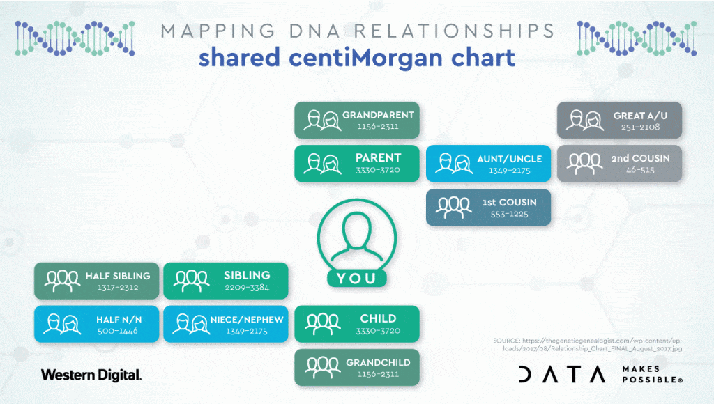 DNA matches are made using a system of measurement called centiMorgans (cM). The number of cMs you have in common with another individual defines the relationship.
