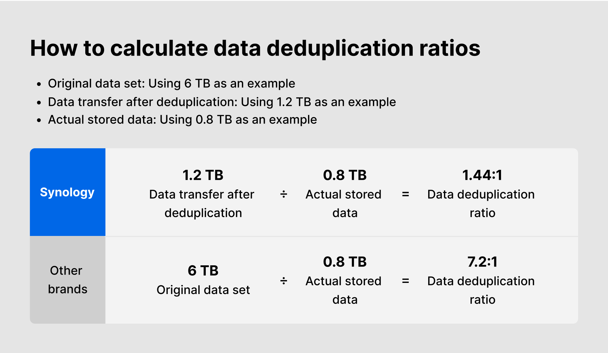 When measuring the efficiency of data deduplication, Synology recommends looking to Stage 2 [Data transfer after deduplication]. If you look at the value generated during Stage 1 [Original data set], this can be misleading as it contains both the “old” and “new” data, which is then divided by the total amount of data that is retained. Some vendors may artificially inflate this number, confusing users as to which stage the vendor actually uses to measure the efficiency of data deduplication.