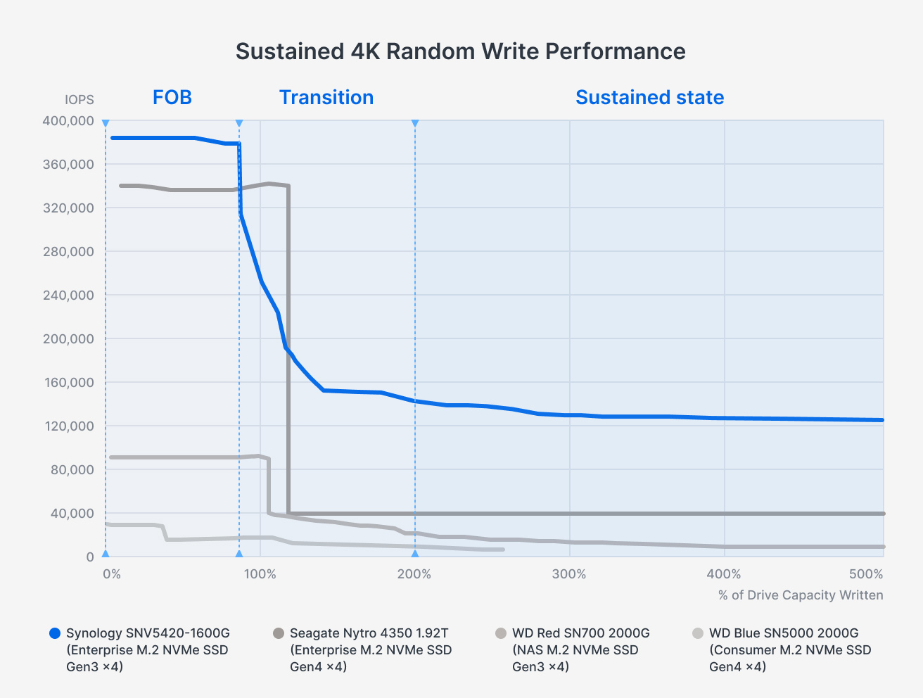 While frequently emphasized in marketing materials, FOB results only reflect a brief period of peak performance and fail to capture long-term behavior under continuous stress. In contrast, analyzing sustained performance with realistic enterprise workloads provides a more accurate evaluation of an SSD’s suitability for NAS use. This approach helps users distinguish between drives optimized for marketing benchmarks and those truly engineered for operational endurance and consistency.