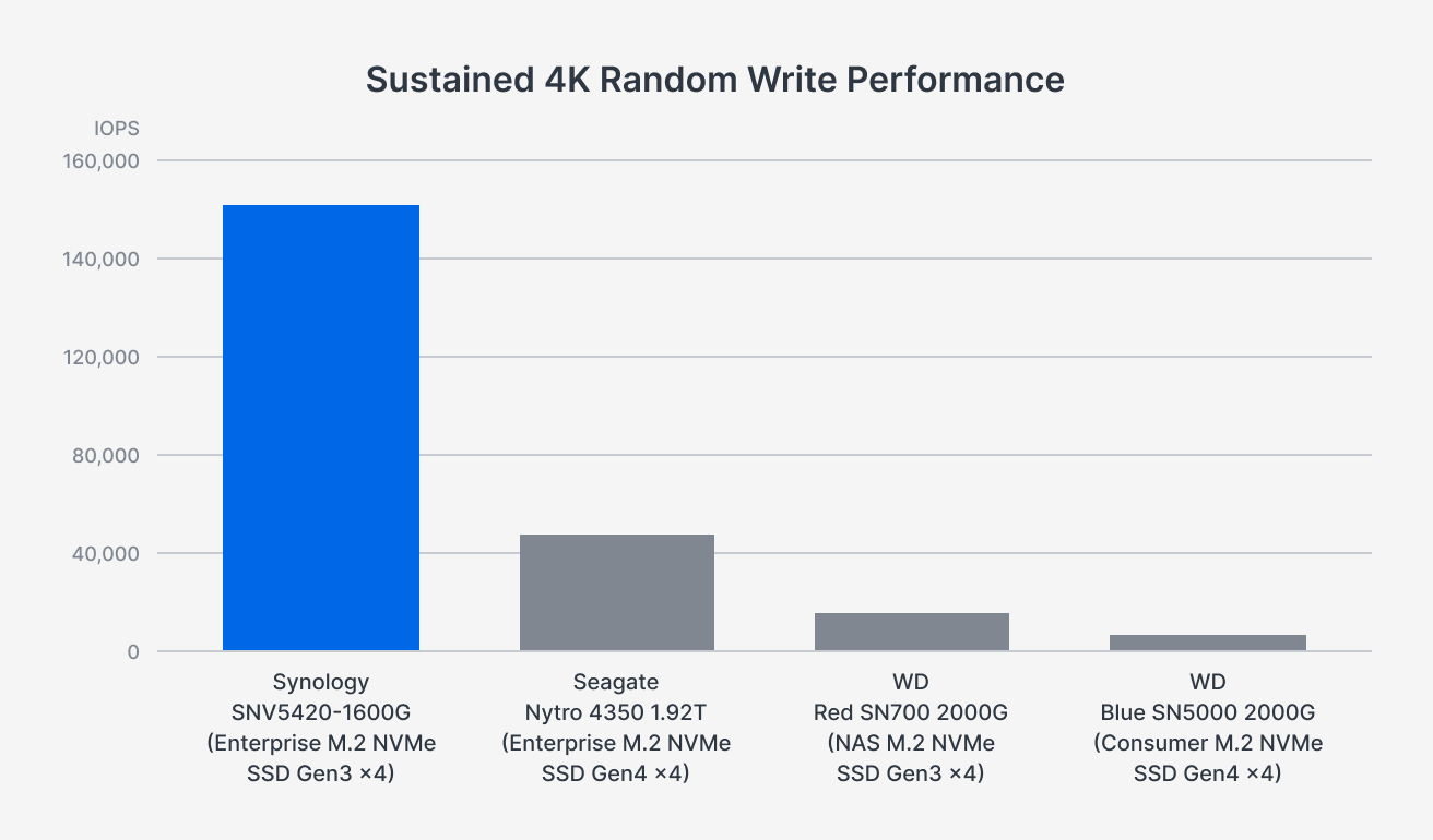 Using a drive that’s not designed for continuous 4K random IO workloads can lead to accelerated wear, performance degradation, and a much higher risk of premature drive failure and data loss.