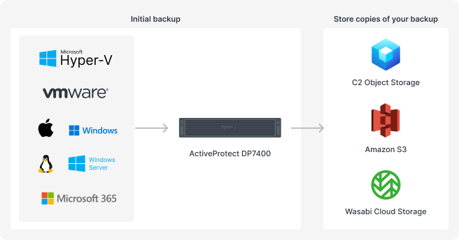 In this case, ActiveProtect DP7400 can be deployed to safeguard critical applications centrally. Using ActiveProtect Manager’s Copy mechanism, backups can be replicated to cloud object storage services such as AWS S3, C2 Object Storage, or Wasabi Cloud Storage, ensuring businesses have an effective off-site backup strategy.