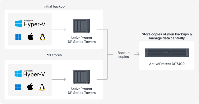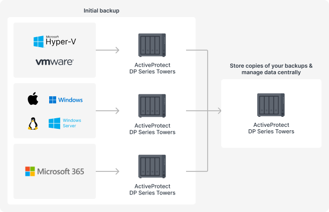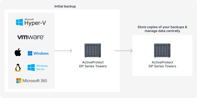 In this case, ActiveProtect DP Series Towers are ideal for performing local backups and enabling businesses to recover data quickly. The backup copy mechanism in ActiveProtect Manager allows companies to replicate and store copies of their data at a separate branch location or at HQ. This is a simple yet effective way to create a disaster recovery architecture.