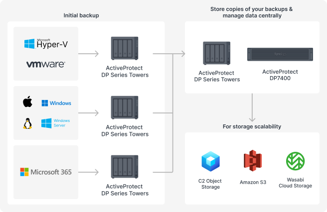 As your business grows, your backups should be flexible and scalable so that you don’t need to revamp your entire backup architecture. With Synology ActiveProtect, companies can introduce high-performance rackmount servers or cloud solutions into their existing infrastructure over time.