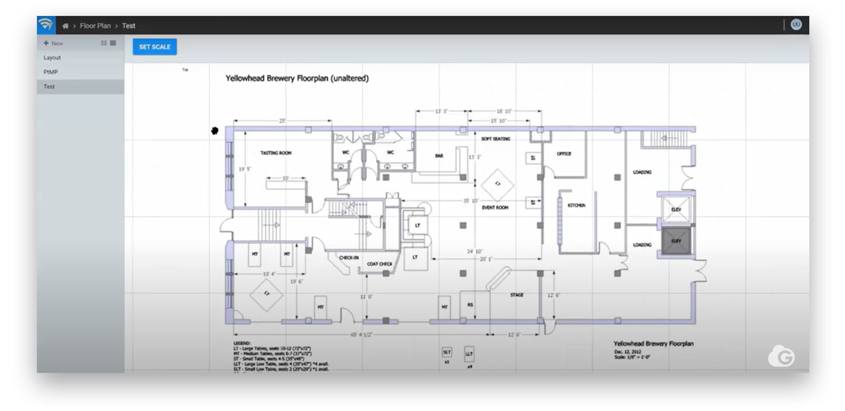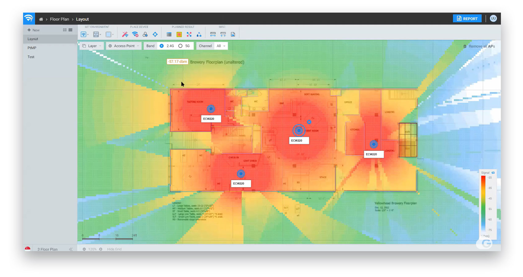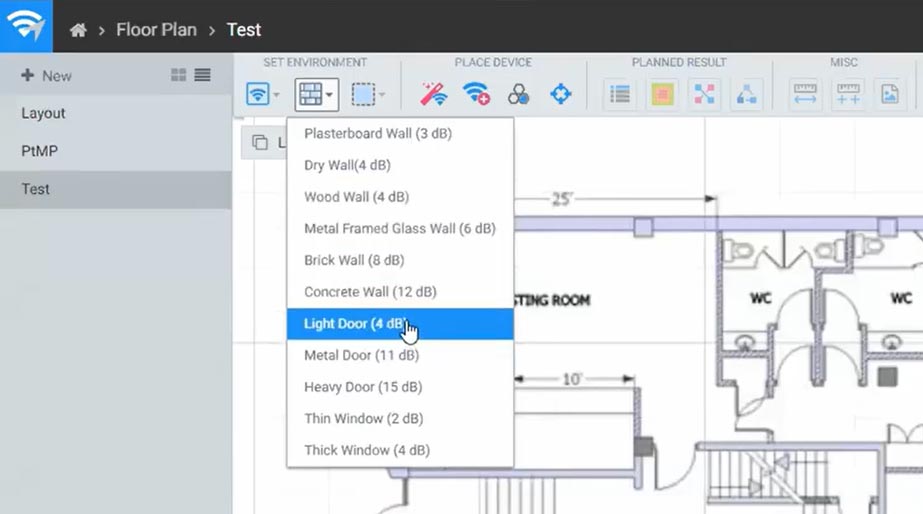 Wi-Fi planners allow you to upload the floor plan of your business for analysis. You can then mark the dimensions of the building or property line and set the scale. Later, when you place access points throughout the floor plan, you’ll get an accurate picture of the range of each access point.
