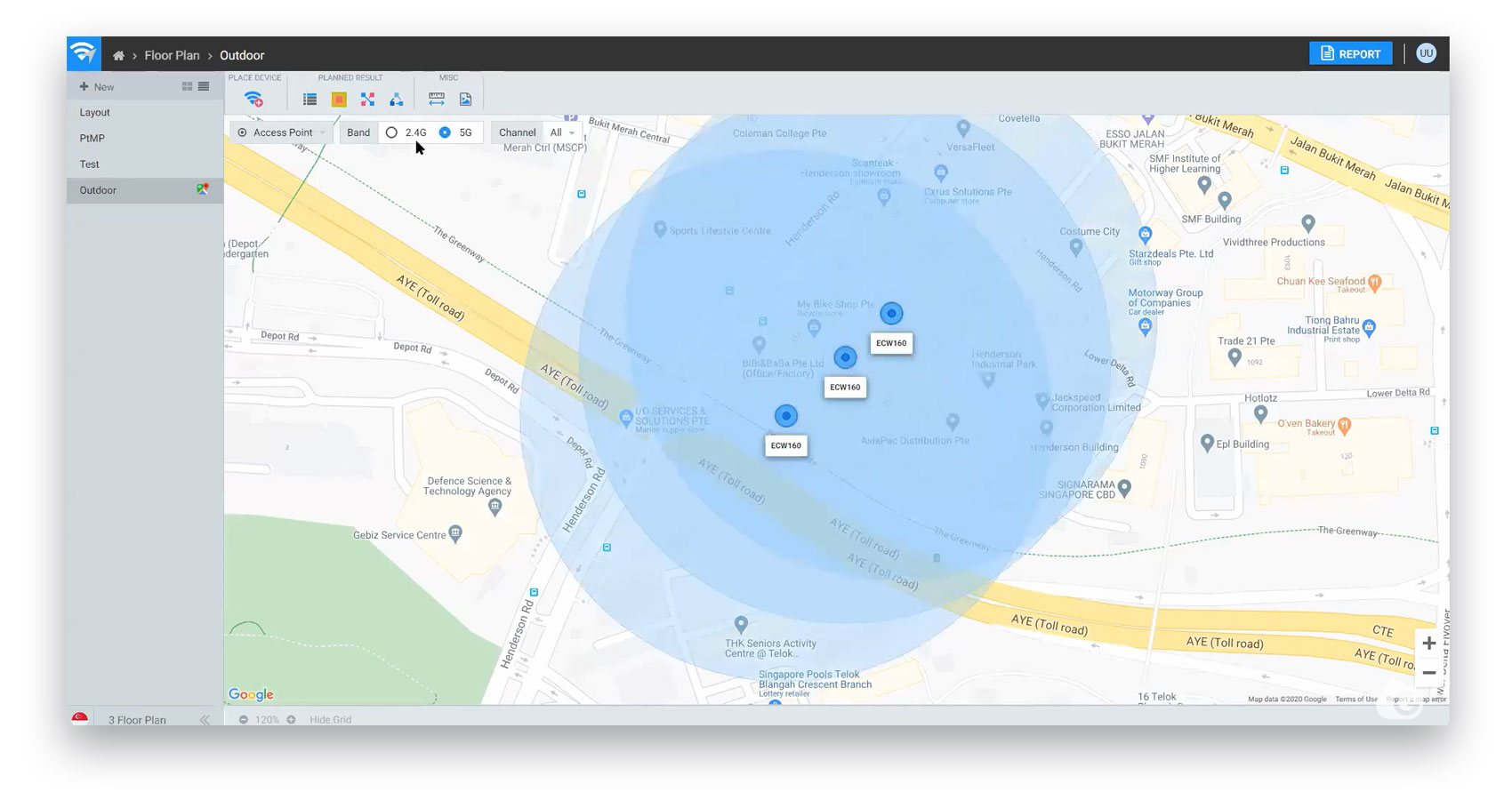 You can also load Google Maps into the WiFi planner, find your property, and deploy outdoor access points with ease. You can select the type of access point and its location as well as the height of the access point as can be seen in the figure below: