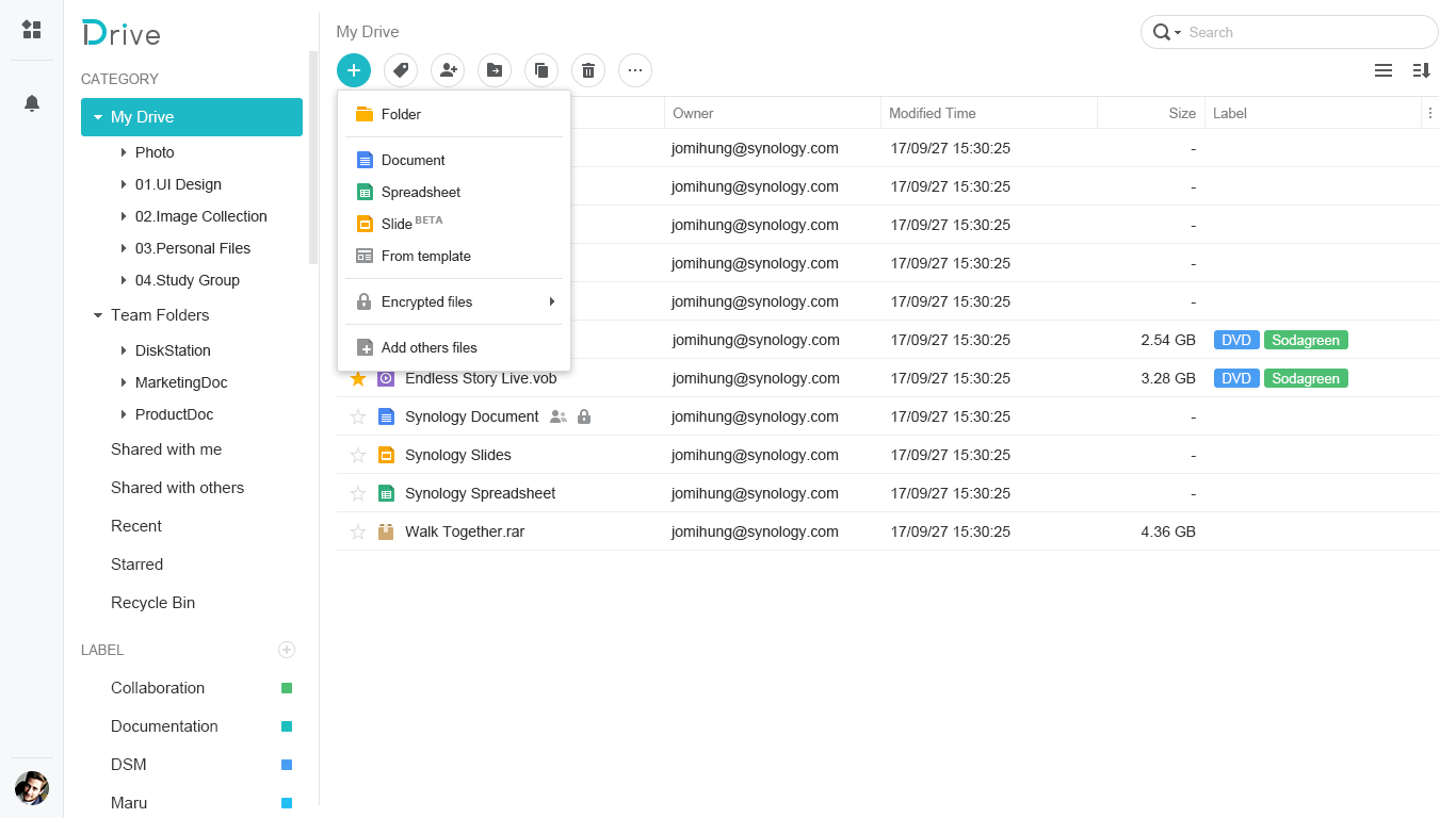 Our traditional SMB file server could only be accessed over a local network. If we needed to access any of the files, we had to go through a VPN. This made nearly every employee host a NAS as their personal file storage and became a hassle when you needed to locate a certain file. It’s even more complicated when you are about to share a file with your colleagues. With both the personal drive and the team folder, Synology Drive thoroughly protects files for every employee. Every time you need to access files, Drive provides various methods, including the original SMB local access and the web portal when you are out of the office. File sharing can be done via the URL or by simply selecting an account to share directly with notifications. This has transformed the original file service into a collaborative one.