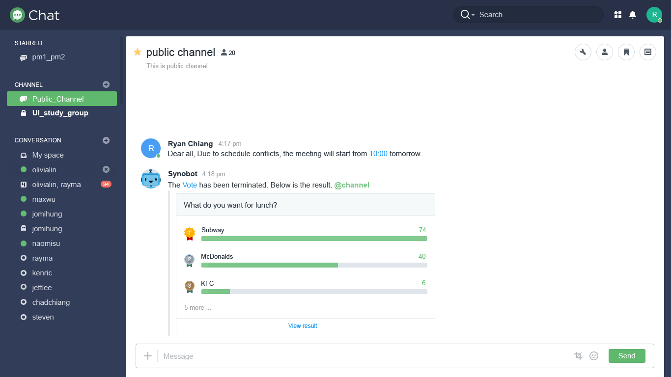 The first thing we ask for a new employee would be the phone number for adding as a contact in a third-party messaging app. Employees have to be manually removed from the messaging app when they leave the company. Chat service integrates with Windows Active Directory and LDAP, so you can start a conversation right away when a newcomer’s account is created. Chat also provides a great file sharing experience. Since you host the service locally, file uploads are faster than public message services, and you own the data at the same time. These advantages make Chat the perfect fit to companies highly concerned about business confidentiality.