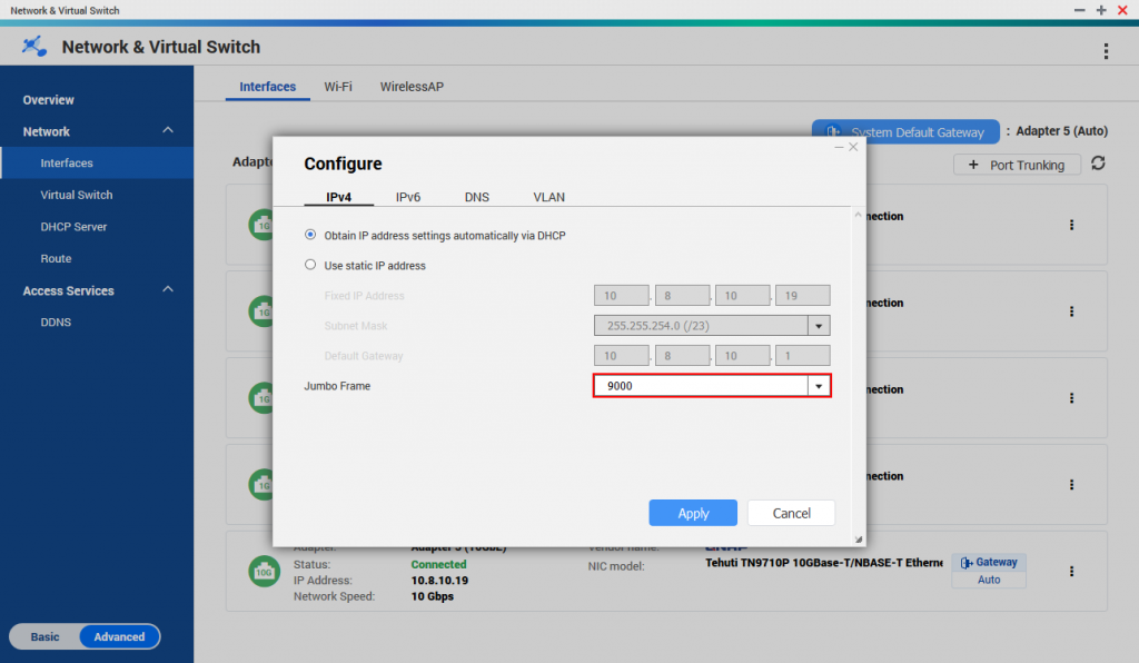 After you’ve got everything plugged in and ready to go, there’s just one small step left. In your NAS and all of your connected devices you need to set the Jumbo Frame (also known as “MTU” – Maximum Transmission Unit) to 9000. On your NAS, this step can be carried out in Network & Virtual Switch. On Windows and macOS this setting can be configured by going to your network adapter properties/settings.