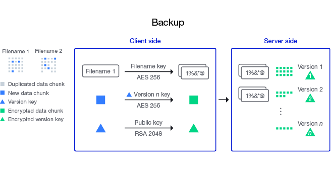 Below is the flow diagram showing how it all works. Suppose you create a backup task (version 1), a filename key and a version 1 key will be generated and protected by AES-256. To further bolster data privacy and security, the version 1 key will be further encrypted using an RSA-2048 public key. Rest assured that your backup data is now safe and sound because all that’s on the server side is encrypted.