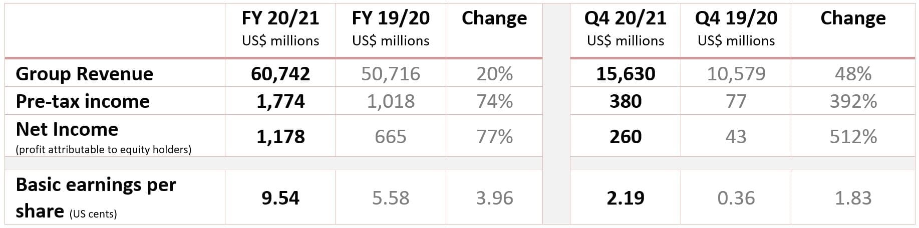 Fourth quarter Group revenue grew at 48% year-to-year to US$15.6 billion. Profit recorded its highest growth rate in two years – with pre-tax income of US$380 million and net income of US$260 million – up 392% and 512% respectively. The Q4 results closed out a record year, with annual Group revenue surging past US$60 billion, adding more than US$10 billion on the previous fiscal year. Profit grew even faster, with pre-tax income of almost US$1.8 billion and net income of US$1.2 billion – both up more than 70% year-on-year.