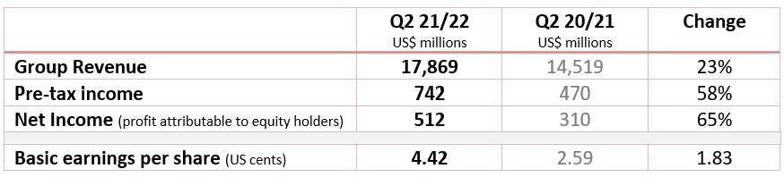 - Significant Q2 revenue growth (30% year-on-year to US$1.36 billion), delivering 7.3% of overall Group revenue and with an operating margin of almost 21%.