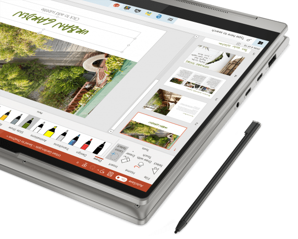The Yoga 9i convertible is also offered in all-metal and multiple colors, including warm Mica on the 14-inch and Slate Grey on the 15-inch model.3