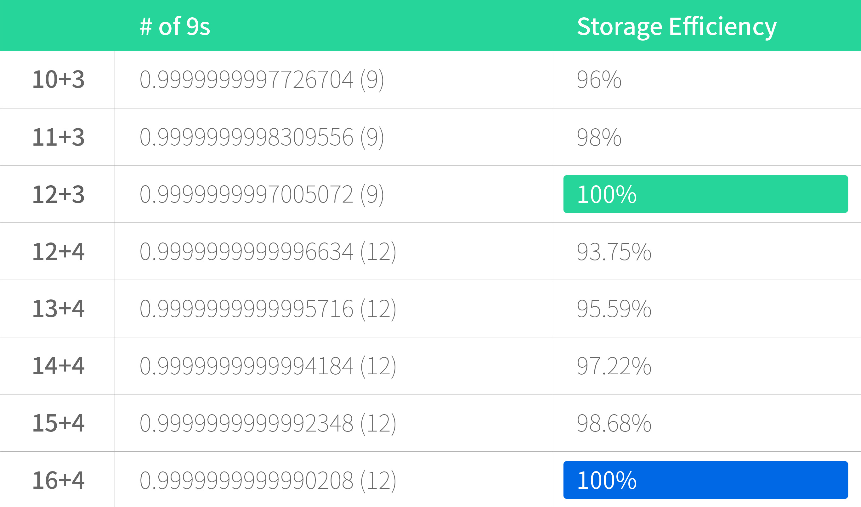 One of the options is to increase the data-stripe width. As shown from the table below, adding the parity fragments works out pretty well in terms of achieving more 9s. We also found that a stripe layout of 16+4 works best in that it significantly improves data durability from 9 nines to 12 nines without impairing storage efficiency. So, adding data pieces from 12+3 to 16+4 is what we’re going to do in the near future.