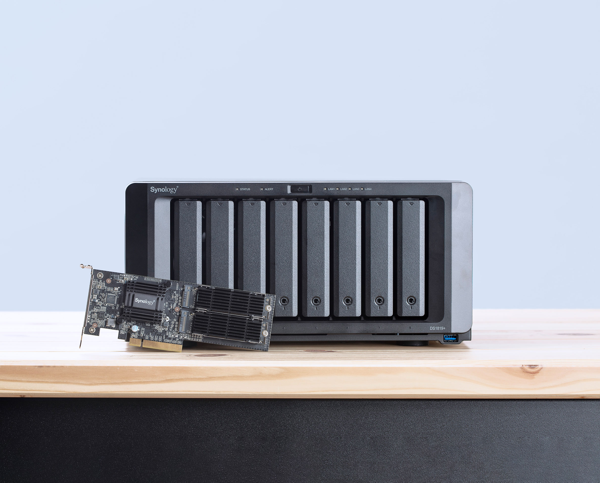 If your NAS features a PCIe slot, you can consider installing a dual M.2 SSD adapter card which supports both SATA and NVMe SSDs to boost cache performance. With Synology M2D18, not only can you reserve more drive bays for data storage, but you also have flexible SSD options, for it supports M.2 modules in format 2280/2260/2242.