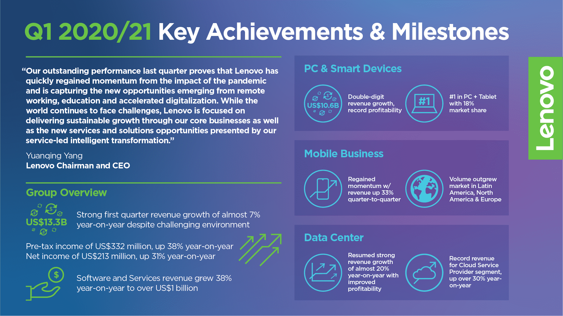 Lenovo today announced first quarter results for fiscal year 2020/21, with Group revenue showing strong growth of 7% year-on-year to reach US$13.3 billion. Pre-tax income grew 38% year-on-year to reach $332 million, and net income grew 31% year-on-year to US$213 million.