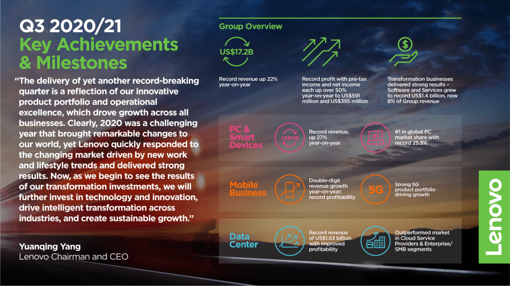 Lenovo today announced third quarter results for fiscal year 2020/21, with Group revenue showing strong growth of 22% year-on-year to reach US$17.2 billion. Pre-tax income grew 52% year-on-year to reach US$591 million, and net income grew 53% year-on-year to US$395 million.