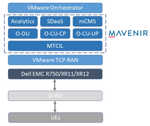- Mavenir cloud-native 5G CU-CP, CU-UP, DU and Mavenir Telco Cloud Integration Layer (MTCIL), Mavenir Centralized Management Service (mCMS) which is a standardized EMS, Smart Deployment as a Service (SDaaS) and analytics.