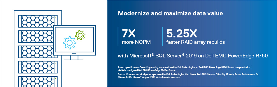 2 Dell EMC PowerEdge R750 Server compared with similarly configured Dell EMC PowerEdge R740xd Server. Source: Prowess white paper, sponsored by Dell Technologies, “Can Newer Dell EMC Servers Offer Significantly Better Performance for Microsoft SQL Server?” August 2021. Actual results may vary.