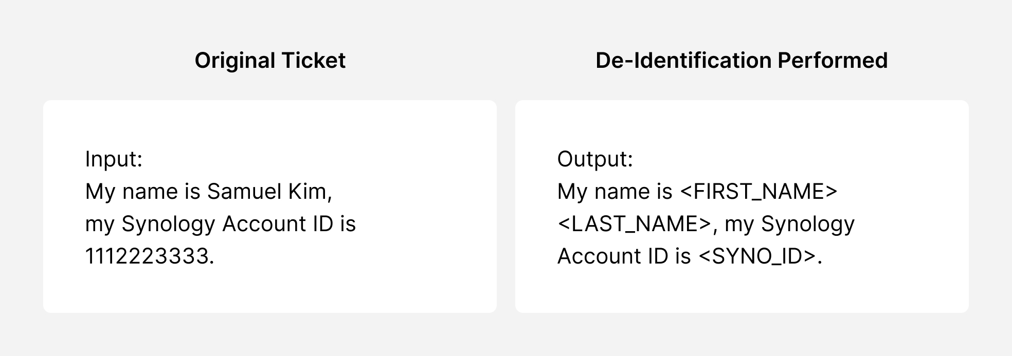This system is built on a foundation of protecting customer privacy with a comprehensive de-identification mechanism that ensures all data from past cases and newly received tickets is anonymized before being used: