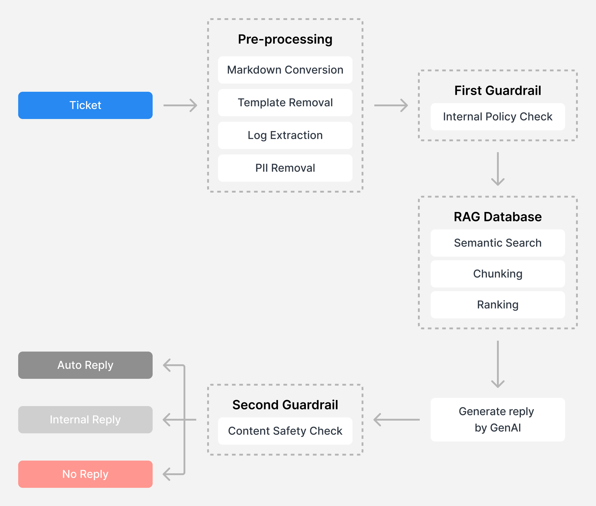 Content Safety Check: The second guardrail ensures the generated responses do not provide sensitive information such as console commands, remote access details, or other contextually accurate data that may be unavailable or inappropriate in certain scenarios. After passing this guardrail, the system will ultimately decide whether to reply automatically or pass the ticket to support staff for review.