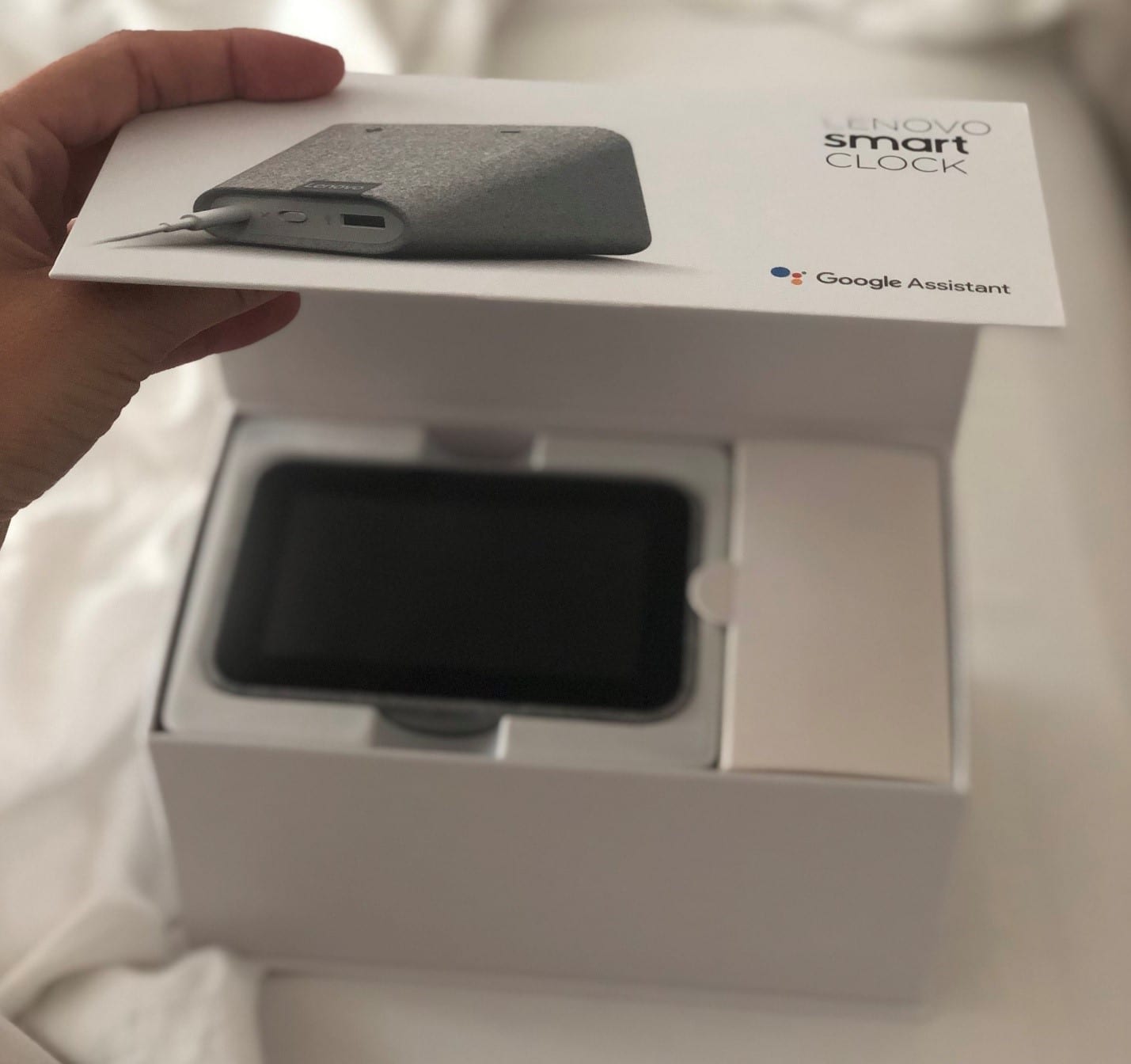 Every little detail to the rubberized buttons on top that you can feel but aren’t distracting. It has a cute little display and a Lenovo “tag” that is perfectly integrated. Even the feet look good. When I put the smart clock on my side table next to my linen upholstered headboard, I gave it an “aww, you belong here”.