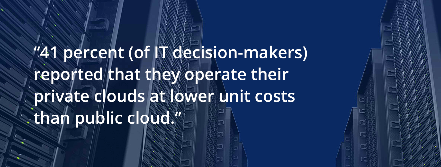 Despite the myth that public cloud is always cheaper, research has shown that companies have been able to drive down the costs of private cloud, achieving TCOs comparable to public cloud. A study conducted by 451 Research interviewed 150 IT-decision-makers where 41 percent reported that they operate their private clouds at lower unit costs than public cloud, citing capacity planning, automation, and costing technologies as the main drivers of cost efficiency. Within that same study, respondents said that even if public cloud providers cut their prices by half (which is highly improbable), they would migrate only 50 percent of their private cloud workloads to a public cloud. It’s clear that businesses see private cloud’s value beyond just cost-efficiency.