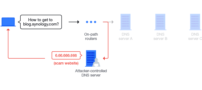For example, if you enter blog.synology.com into your browser, it will contact (often multiple) DNS servers, asking for their help until it finds the IP address associated with the domain blog.synology.com (e.g., 1.23.456.789).