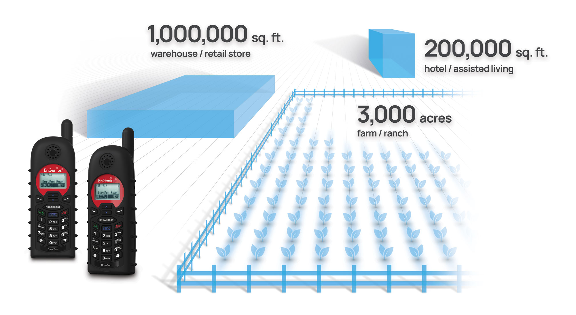 The most important feature for large footprint facilities is range. Long-range wireless communications allow users to roam about the property to areas other cordless devices simply can’t reach—trash bins, parking lots, gas pumps, and delivery areas. EnGenius phones use the 900 MHz spectrum versus DECT or Wi-Fi which, as mentioned before, suffer from insufficient range and interference. Specifically, the EnGenius DuraFon Roam is capable of the following ranges: